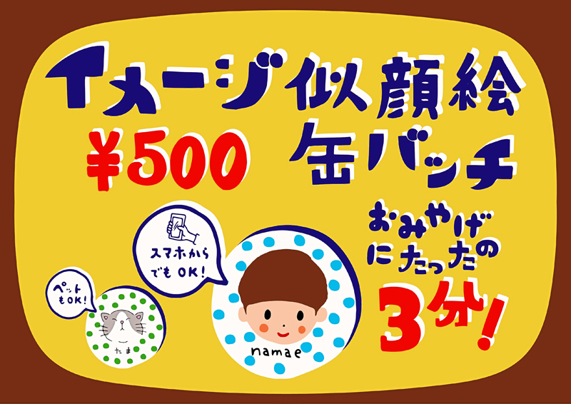 3分でできるイメージ似顔絵缶バッチ!1人500円!ペットなどお写真からもOK!