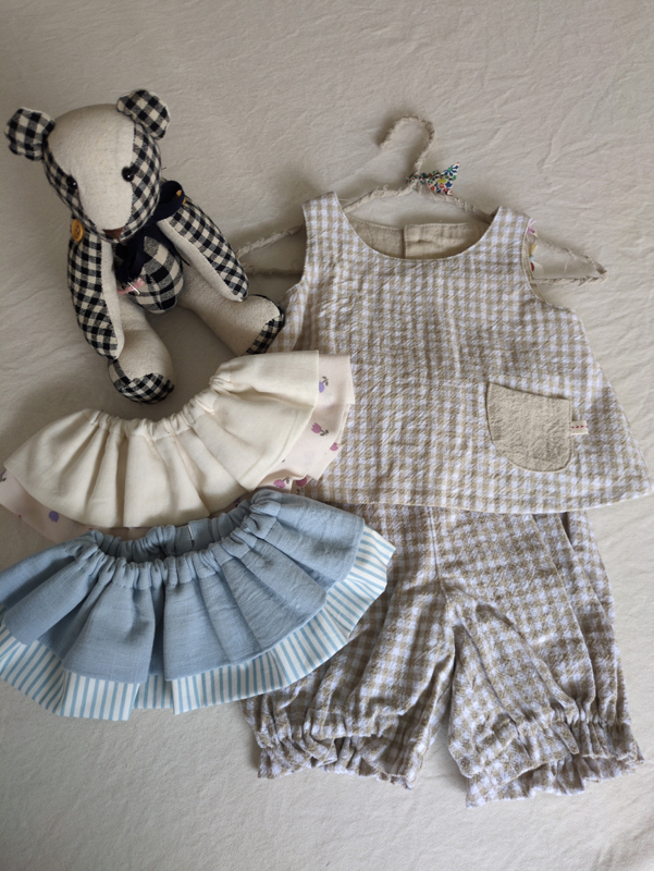 ベビー用品、子ども服を作っています。手に取ってご覧ください。大人かっぽう着もお持ちします。