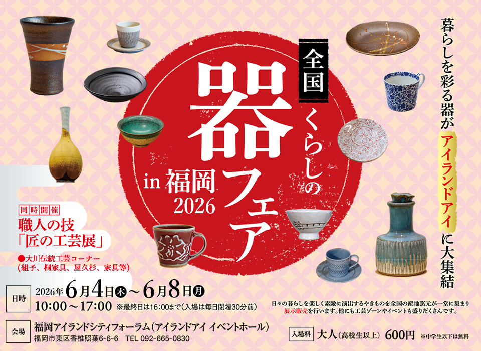 「アイランドアイ 全国くらしの器フェアin福岡」では、日々の暮らしを楽しく素敵に演出する陶磁器・陶器・やきものを全国の陶磁器産地窯元が一堂に集まり、展示販売を行います。 他にも工芸ゾーンやイベントも盛りだくさんです。