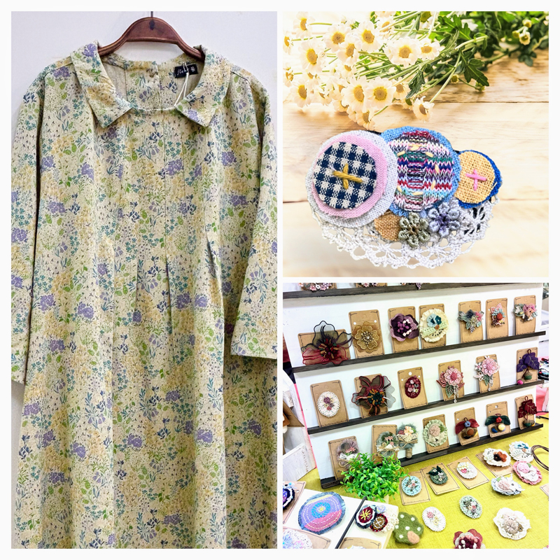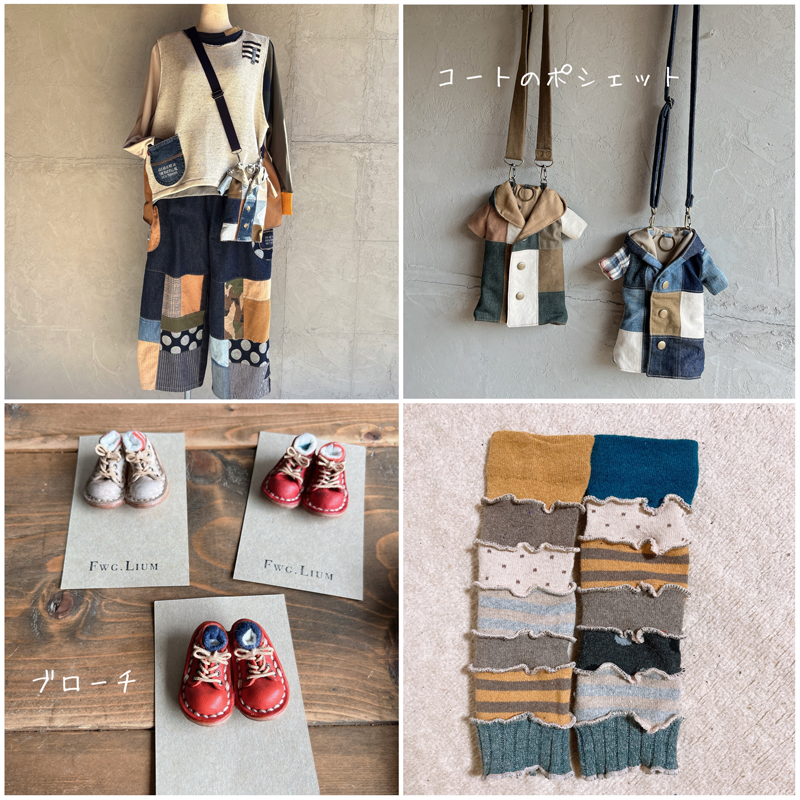 パッチワークしたデニムやニット生地で一点物のお洋服と、普段使いが楽しくなるアイテムの革小物や布小物
