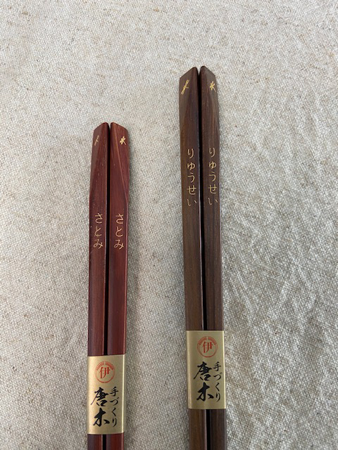 木と箸先にこだわったつまみやすいお箸に無料でお名前やメッセージを入れていきます。